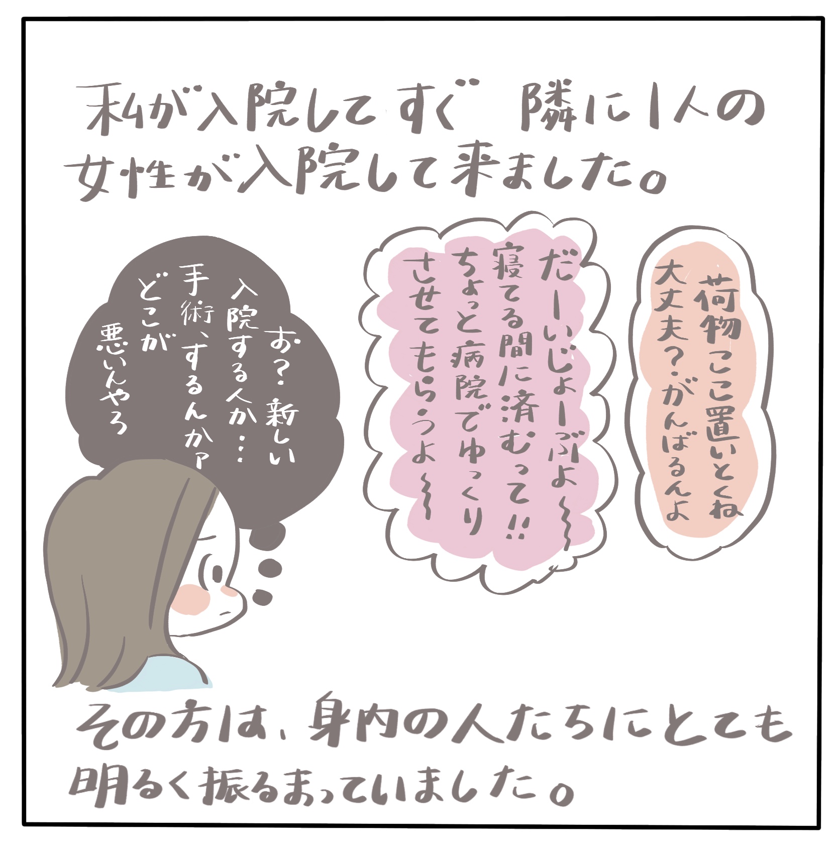 私は個室ではなかったので入院中に何人か入退院をしていました。 その人たちは多分、あたしよりも深刻な病気で、みなさん元気!!って 感じに一見見えるのです、1人になった時、ふとした時に見せる表情や様子が とてもとても辛そうでした。 私でさえも今回の手術が決まったことでショックはあったし、辛かった もっと重い病気だったり、受け入れ難い事実、内容の病気だったとしたら どれほど辛いだろう、悲しいだろう、と感じました。 隣から悲しそうな泣き声を聞くたびに私の心は折れていきました。